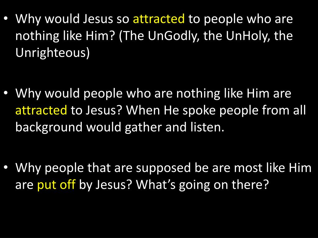 Why would Jesus so attracted to people who are nothing like Him? (The UnGodly, the UnHoly, the Unrighteous) • Why would people who are nothing like Him are attracted to Jesus? When He spoke people from all background would gather and listen. • Why people that are supposed be are most like Him are put off by Jesus? What’s going on there?