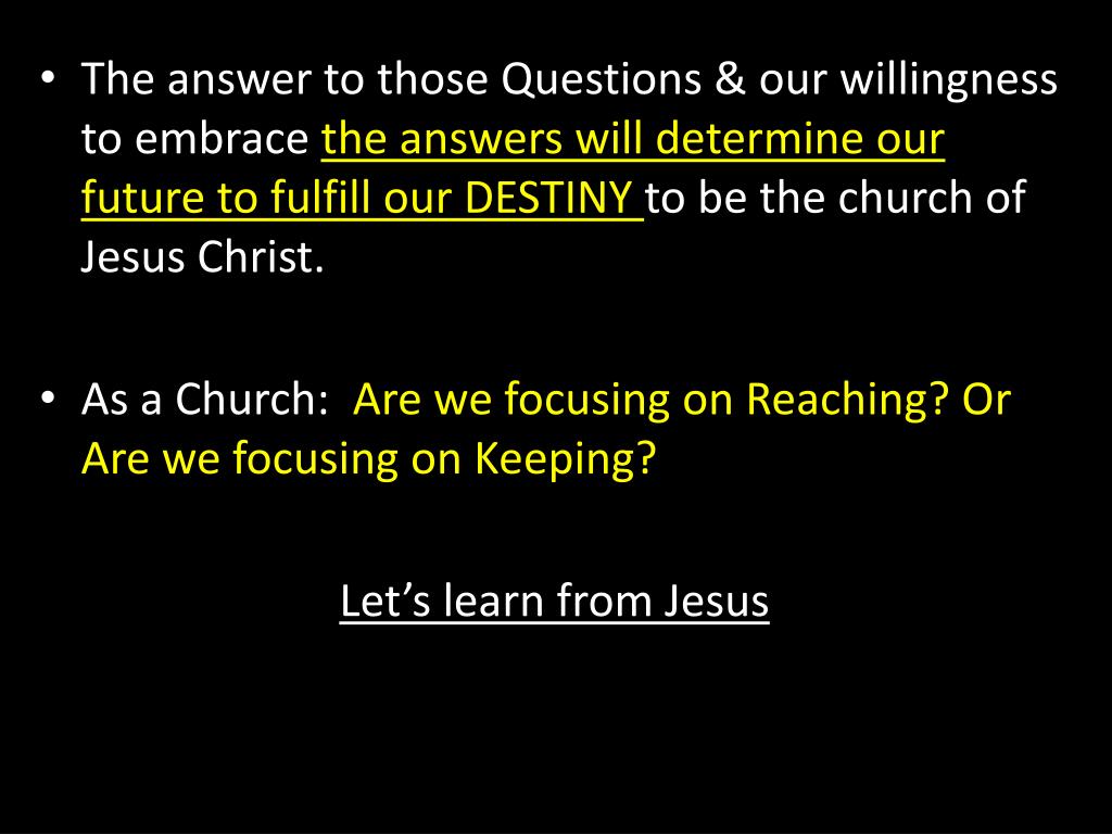 The answer to those Questions & our willingness to embrace the answers will determine our future to fulfill our DESTINY to be the church of Jesus Christ. • As a Church: Are we focusing on Reaching? Or Are we focusing on Keeping? Let’s learn from Jesus