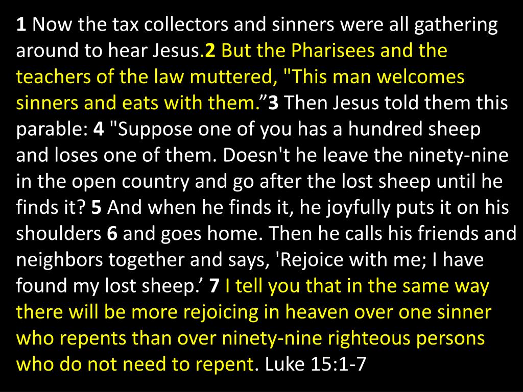 1 Now the tax collectors and sinners were all gathering around to hear Jesus.2 But the Pharisees and the teachers of the law muttered, "This man welcomes sinners and eats with them.”3 Then Jesus told them this parable: 4 "Suppose one of you has a hundred sheep and loses one of them. Doesn't he leave the ninety-nine in the open country and go after the lost sheep until he finds it? 5 And when he finds it, he joyfully puts it on his shoulders 6 and goes home. Then he calls his friends and neighbors together and says, 'Rejoice with me; I have found my lost sheep.’ 7I tell you that in the same way there will be more rejoicing in heaven over one sinner who repents than over ninety-nine righteous persons who do not need to repent. Luke 15:1-7