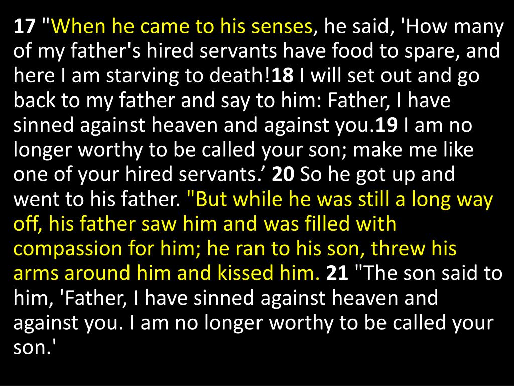 17 "When he came to his senses, he said, 'How many of my father's hired servants have food to spare, and here I am starving to death!18 I will set out and go back to my father and say to him: Father, I have sinned against heaven and against you.19 I am no longer worthy to be called your son; make me like one of your hired servants.’ 20 So he got up and went to his father. "But while he was still a long way off, his father saw him and was filled with compassion for him; he ran to his son, threw his arms around him and kissed him.21 "The son said to him, 'Father, I have sinned against heaven and against you. I am no longer worthy to be called your son.'