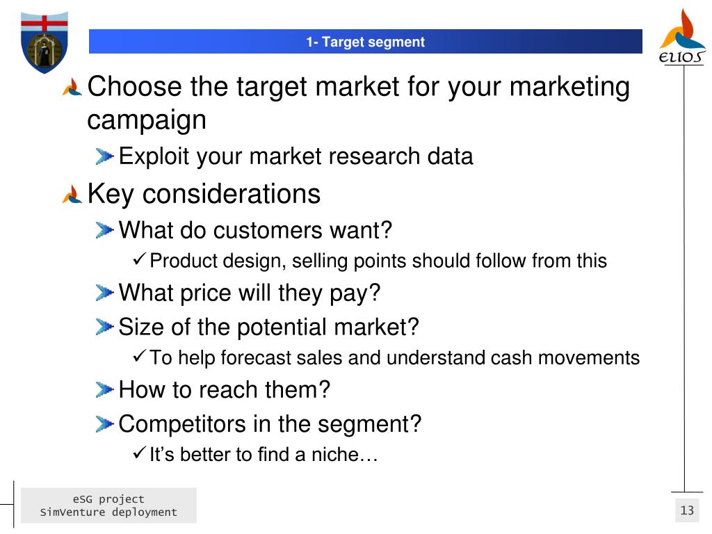 1- Target segment • Choose the target market for your marketing campaign • Exploit your market research data • Key considerations • What do customers want? • Product design, selling points should follow from this • What price will they pay? • Size of the potential market? • To help forecast sales and understand cash movements • How to reach them? • Competitors in the segment? • It’s better to find a niche…