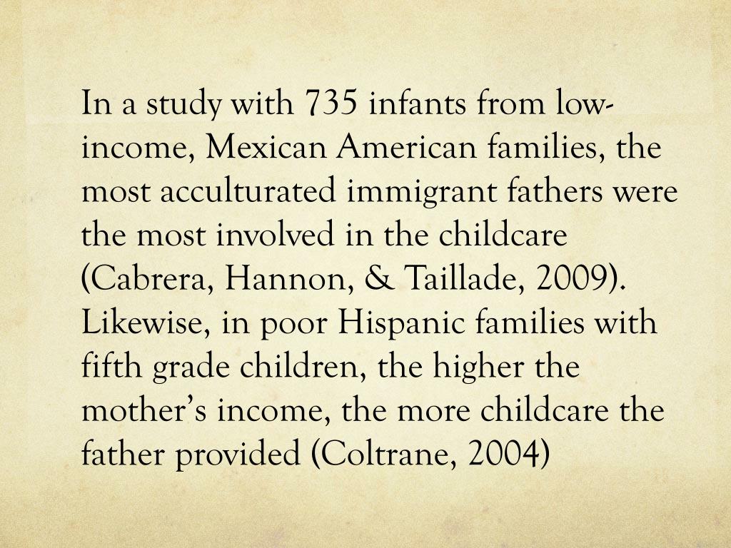 In a study with 735 infants from low-income, Mexican American families, the most acculturated immigrant fathers were the most involved in the childcare (Cabrera, Hannon, & Taillade, 2009). Likewise, in poor Hispanic families with fifth grade children, the higher the mother’s income, the more childcare the father provided (Coltrane, 2004)