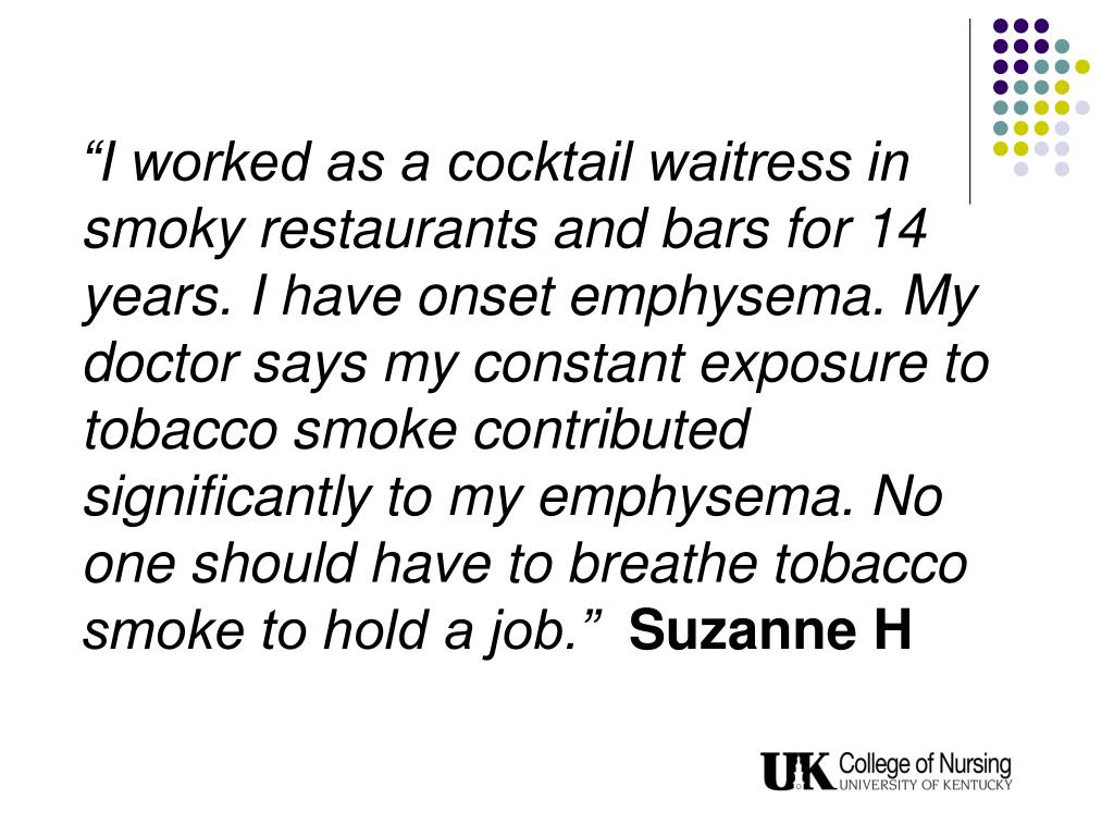 “I worked as a cocktail waitress in smoky restaurants and bars for 14 years. I have onset emphysema. My doctor says my constant exposure to tobacco smoke contributed significantly to my emphysema. No one should have to breathe tobacco smoke to hold a job.”Suzanne H
