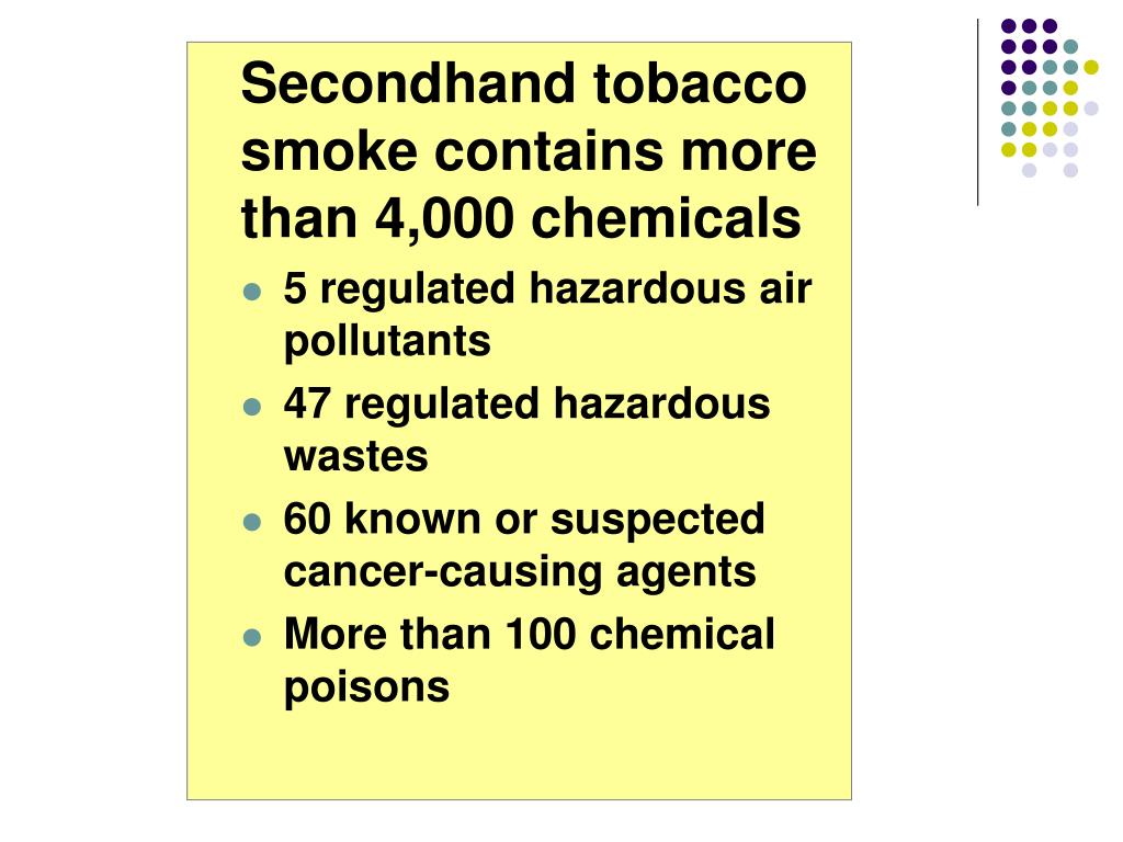 Secondhand tobacco smoke contains more than 4,000 chemicals • 5 regulated hazardous air pollutants • 47 regulated hazardous wastes • 60 known or suspected cancer-causing agents • More than 100 chemical poisons