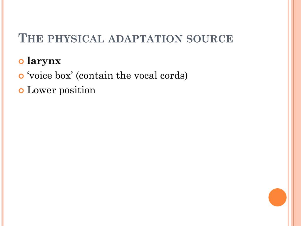 The physical adaptation source • larynx • ‘voice box’ (contain the vocal cords) • Lower position