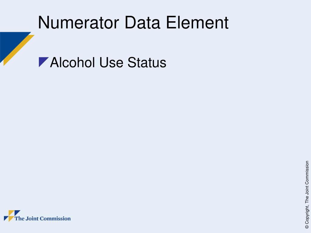 Numerator Populations • Included Populations: • Patients with blood alcohol concentration (BAC) test indicating acute intoxication • Patients refusing screening • Excluded Populations: None