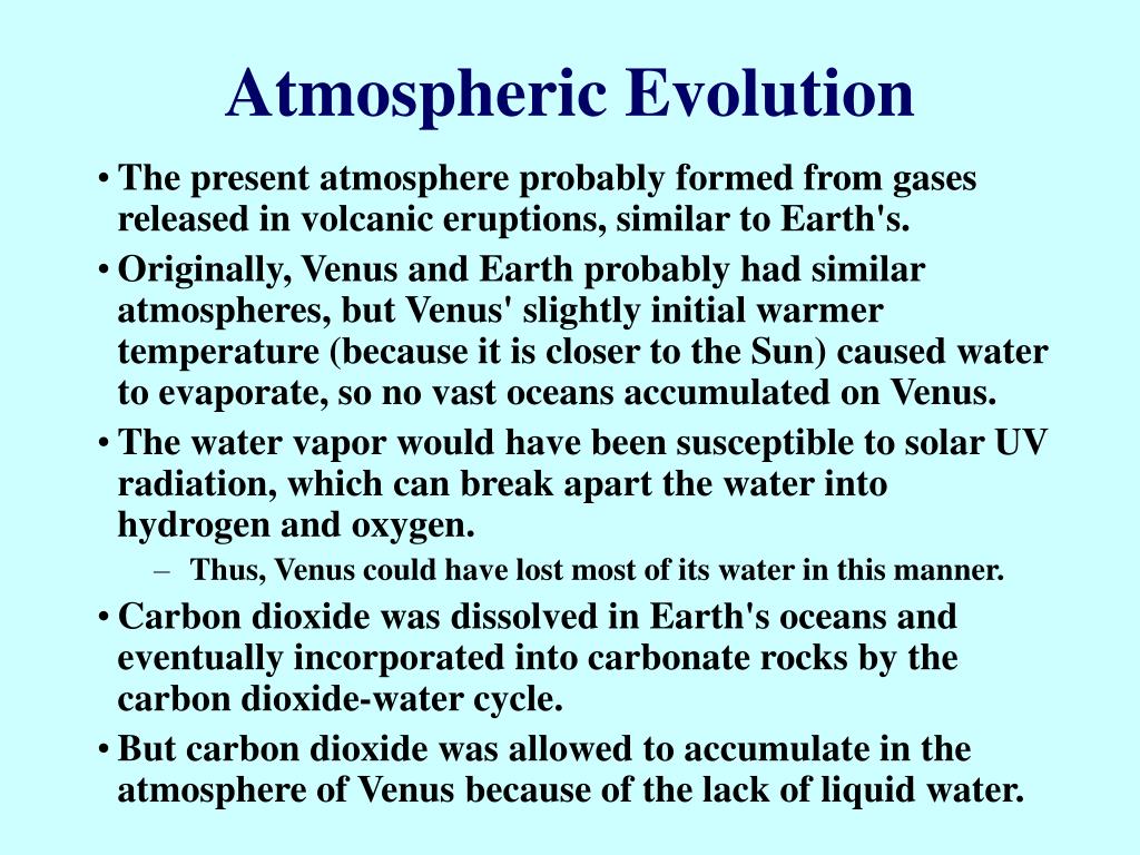 Atmospheric Evolution • The present atmosphere probably formed from gases released in volcanic eruptions, similar to Earth's. • Originally, Venus and Earth probably had similar atmospheres, but Venus' slightly initial warmer temperature (because it is closer to the Sun) caused water to evaporate, so no vast oceans accumulated on Venus. • The water vapor would have been susceptible to solar UV radiation, which can break apart the water into hydrogen and oxygen. • Thus, Venus could have lost most of its water in this manner. • Carbon dioxide was dissolved in Earth's oceans and eventually incorporated into carbonate rocks by the carbon dioxide-water cycle. • But carbon dioxide was allowed to accumulate in the atmosphere of Venus because of the lack of liquid water.