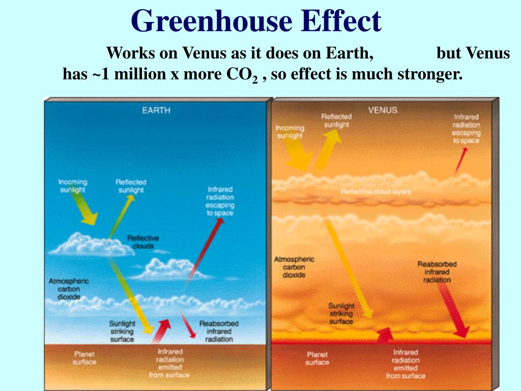 Greenhouse Effect Works on Venus as it does on Earth, but Venus has ~1 million x more CO2 , so effect is much stronger.