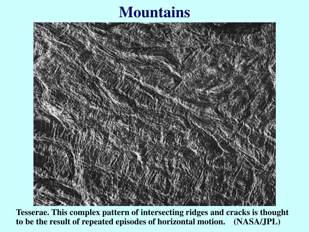 Mountains Tesserae. This complex pattern of intersecting ridges and cracks is thought to be the result of repeated episodes of horizontal motion. (NASA/JPL)