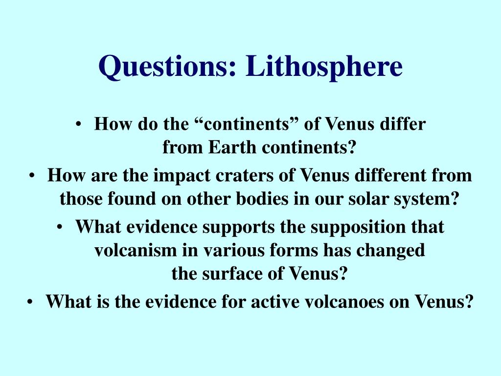 Questions: Lithosphere • How do the “continents” of Venus differ from Earth continents? • How are the impact craters of Venus different from those found on other bodies in our solar system? • What evidence supports the supposition that volcanism in various forms has changed the surface of Venus? • What is the evidence for active volcanoes on Venus?
