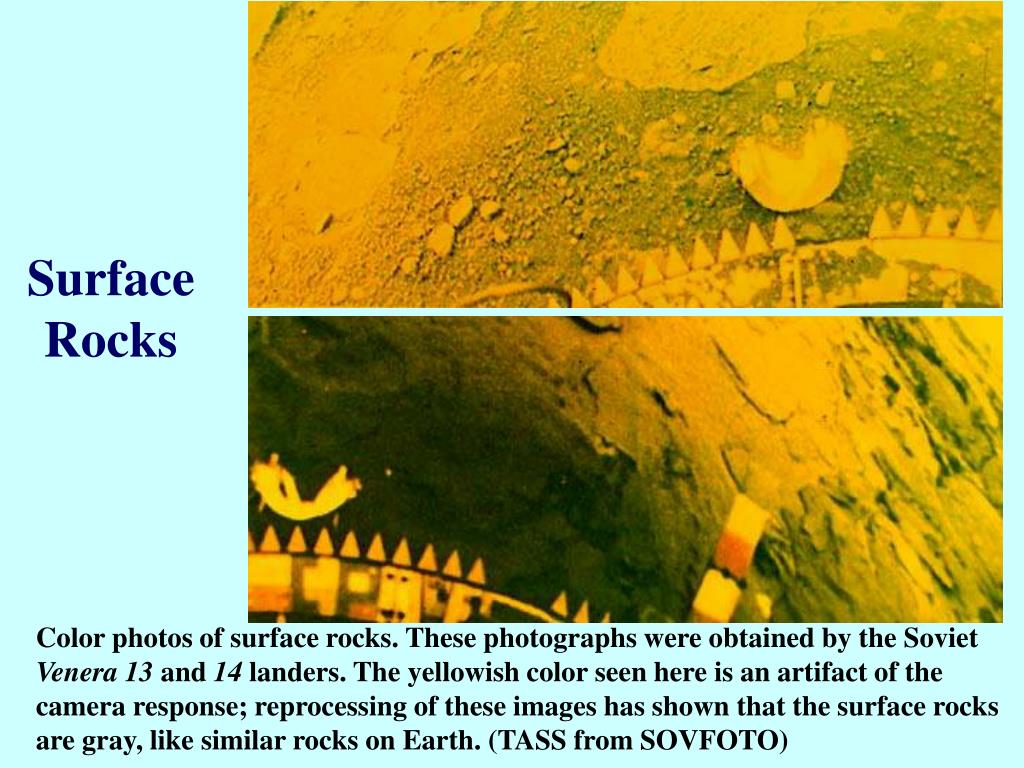 Surface Rocks Color photos of surface rocks. These photographs were obtained by the Soviet Venera 13 and 14 landers. The yellowish color seen here is an artifact of the camera response; reprocessing of these images has shown that the surface rocks are gray, like similar rocks on Earth. (TASS from SOVFOTO)