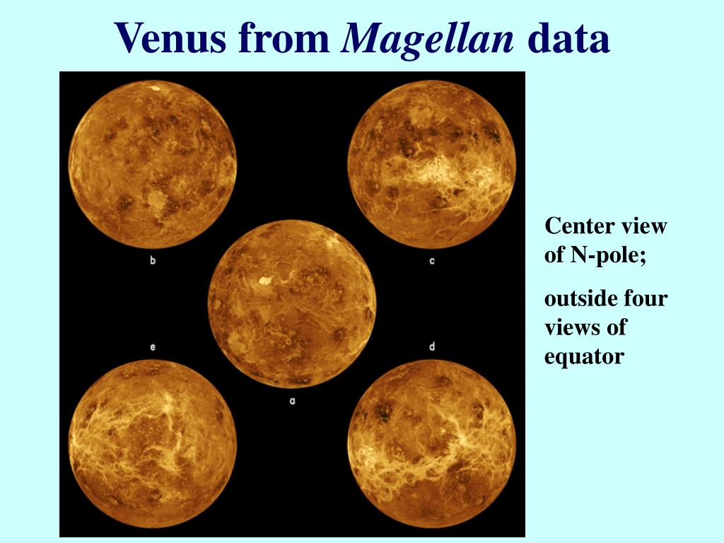 Venus from Magellan data Center view of N-pole; outside four views of equator