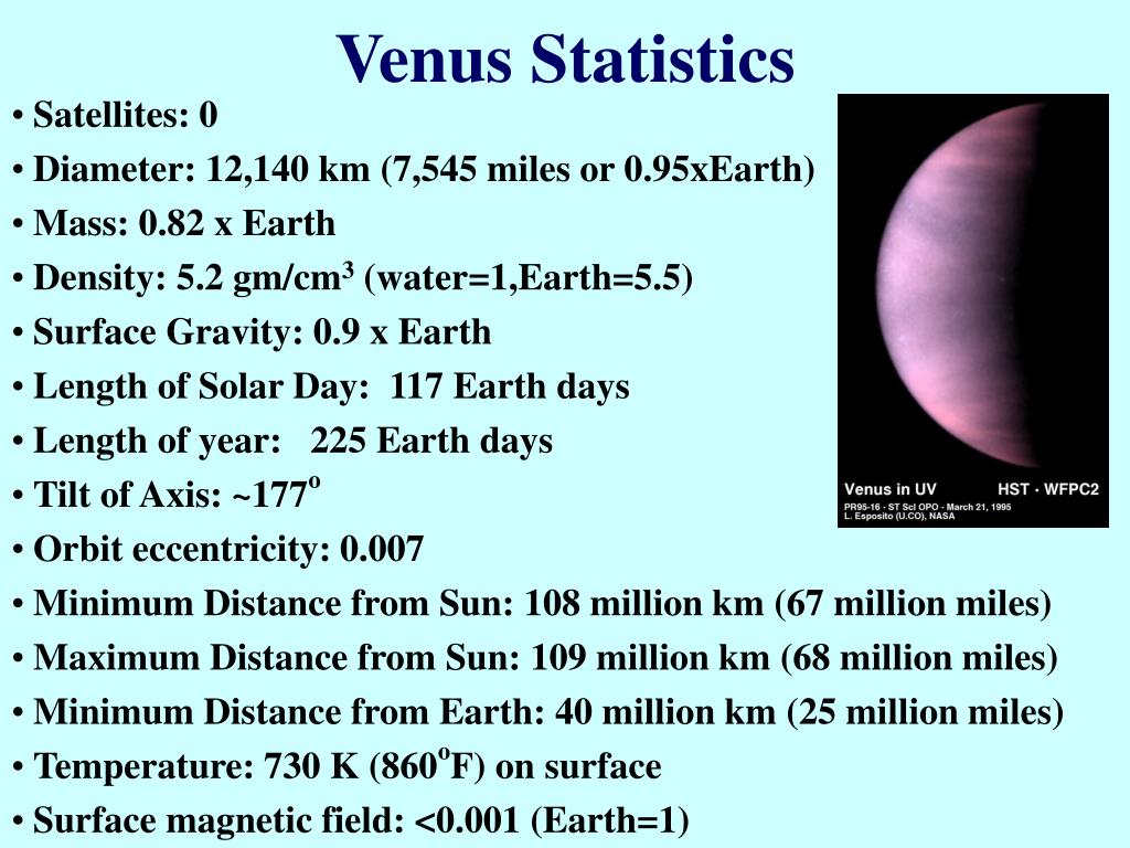 Venus Statistics • Satellites: 0 • Diameter: 12,140 km (7,545 miles or 0.95xEarth) • Mass: 0.82 x Earth • Density: 5.2 gm/cm3 (water=1,Earth=5.5) • Surface Gravity: 0.9 x Earth • Length of Solar Day: 117 Earth days • Length of year: 225 Earth days • Tilt of Axis: ~177o • Orbit eccentricity: 0.007 • Minimum Distance from Sun: 108 million km (67 million miles) • Maximum Distance from Sun: 109 million km (68 million miles) • Minimum Distance from Earth: 40 million km (25 million miles) • Temperature: 730 K (860oF) on surface • Surface magnetic field: <0.001 (Earth=1)