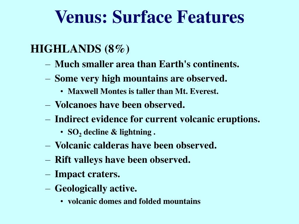 Venus: Surface Features HIGHLANDS (8%) • Much smaller area than Earth's continents. • Some very high mountains are observed. • Maxwell Montes is taller than Mt. Everest. • Volcanoes have been observed. • Indirect evidence for current volcanic eruptions. • SO2 decline & lightning . • Volcanic calderas have been observed. • Rift valleys have been observed. • Impact craters. • Geologically active. • volcanic domes and folded mountains