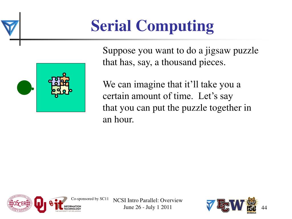 Serial Computing Suppose you want to do a jigsaw puzzle that has, say, a thousand pieces. We can imagine that it’ll take you a certain amount of time. Let’s say that you can put the puzzle together in an hour. NCSI Intro Parallel: Overview June 26 - July 1 2011