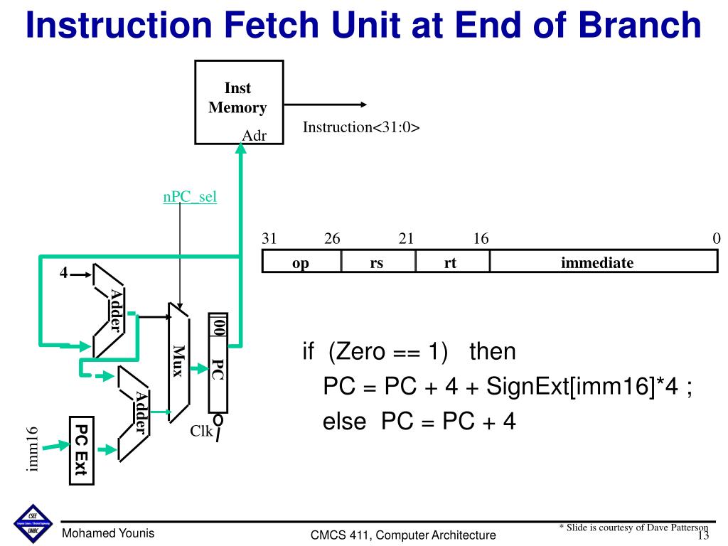 Instruction Fetch Unit at End of Branch 31 26 21 16 0 op rs rt immediate Inst Memory Instruction<31:0> Adr nPC_sel 4 00 Adder PC Mux Clk Adder imm16 PC Ext if (Zero == 1) then PC = PC + 4 + SignExt[imm16]*4 ; else PC = PC + 4 * Slide is courtesy of Dave Patterson CMCS 411, Computer Architecture13