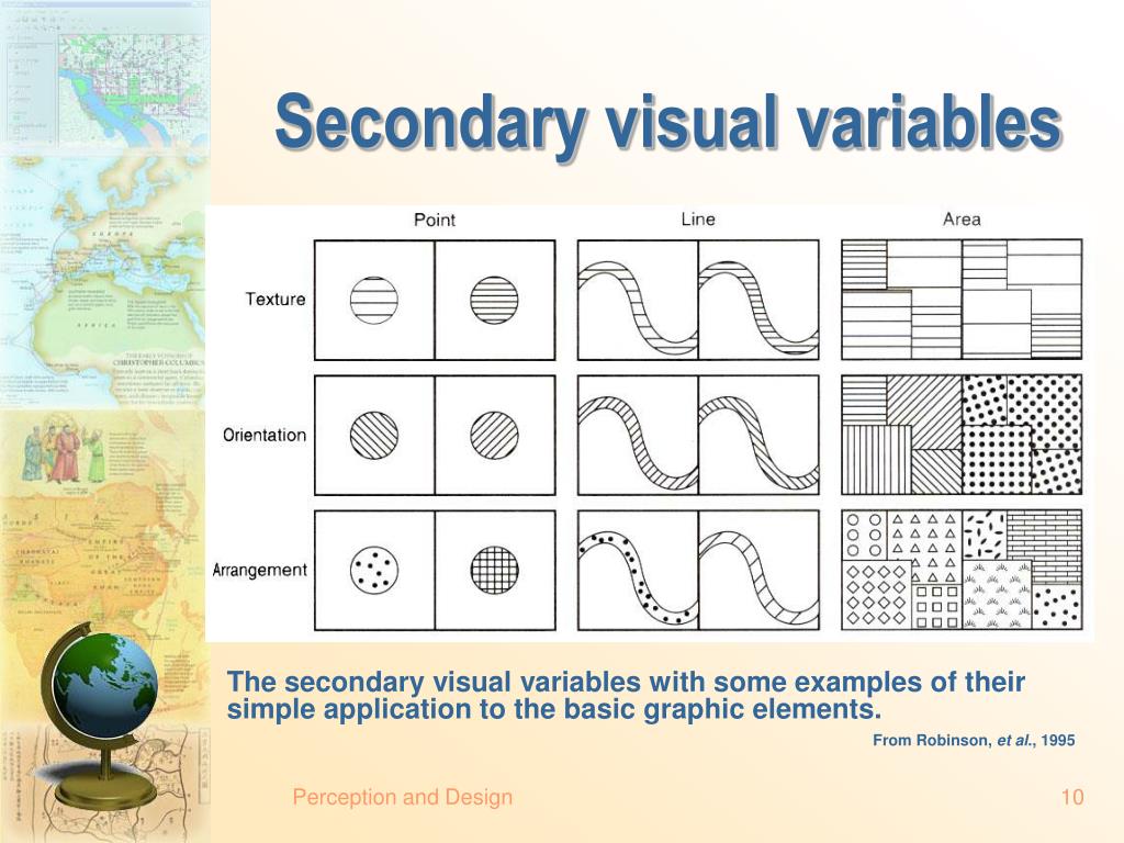 Secondary visual variables The secondary visual variables with some examples of their simple application to the basic graphic elements. From Robinson, et al., 1995 Perception and Design
