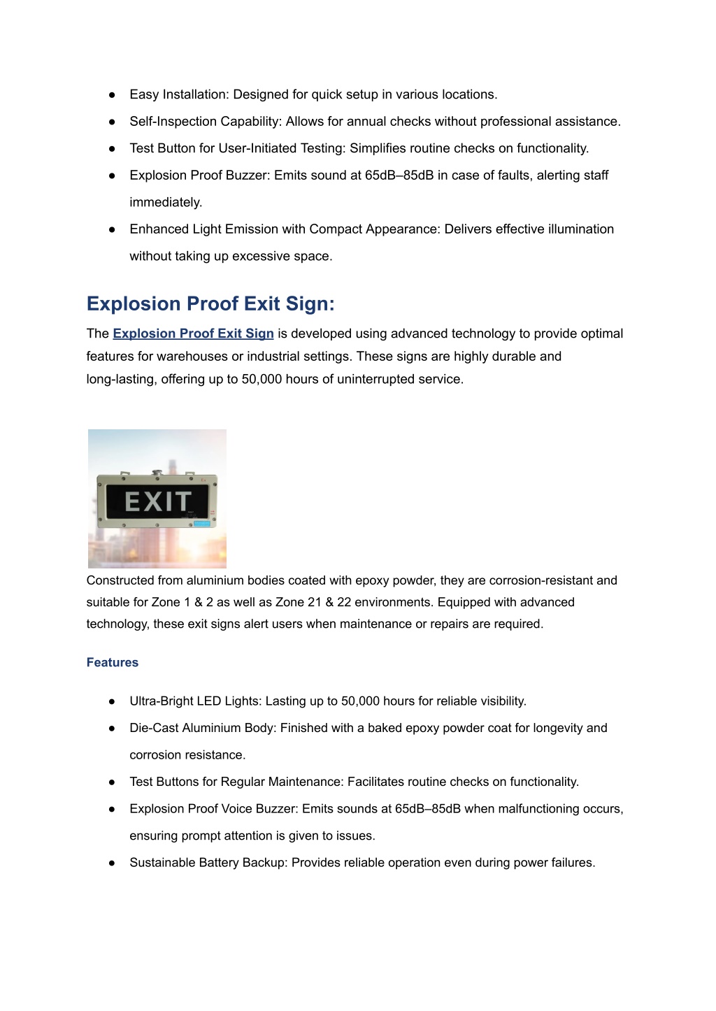 ● Easy Installation: Designed for quick setup in various locations. ● Self-Inspection Capability: Allows for annual checks without professional assistance. ● Test Button for User-Initiated Testing: Simplifies routine checks on functionality. ● Explosion Proof Buzzer: Emits sound at 65dB–85dB in case of faults, alerting staff immediately. ● Enhanced Light Emission with Compact Appearance: Delivers effective illumination without taking up excessive space. Explosion Proof Exit Sign: The Explosion Proof Exit Sign is developed using advanced technology to provide optimal features for warehouses or industrial settings. These signs are highly durable and long-lasting, offering up to 50,000 hours of uninterrupted service. Constructed from aluminium bodies coated with epoxy powder, they are corrosion-resistant and suitable for Zone 1 & 2 as well as Zone 21 & 22 environments. Equipped with advanced technology, these exit signs alert users when maintenance or repairs are required. Features ● Ultra-Bright LED Lights: Lasting up to 50,000 hours for reliable visibility. ● Die-Cast Aluminium Body: Finished with a baked epoxy powder coat for longevity and corrosion resistance. ● Test Buttons for Regular Maintenance: Facilitates routine checks on functionality. ● Explosion Proof Voice Buzzer: Emits sounds at 65dB–85dB when malfunctioning occurs, ensuring prompt attention is given to issues. ● Sustainable Battery Backup: Provides reliable operation even during power failures.