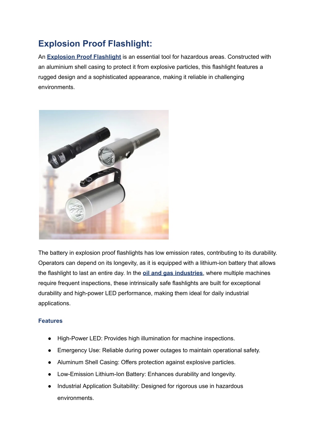 Explosion Proof Flashlight: An Explosion Proof Flashlight is an essential tool for hazardous areas. Constructed with an aluminium shell casing to protect it from explosive particles, this flashlight features a rugged design and a sophisticated appearance, making it reliable in challenging environments. The battery in explosion proof flashlights has low emission rates, contributing to its durability. Operators can depend on its longevity, as it is equipped with a lithium-ion battery that allows the flashlight to last an entire day. In the oil and gas industries, where multiple machines require frequent inspections, these intrinsically safe flashlights are built for exceptional durability and high-power LED performance, making them ideal for daily industrial applications. Features ● High-Power LED: Provides high illumination for machine inspections. ● Emergency Use: Reliable during power outages to maintain operational safety. ● Aluminum Shell Casing: Offers protection against explosive particles. ● Low-Emission Lithium-Ion Battery: Enhances durability and longevity. ● Industrial Application Suitability: Designed for rigorous use in hazardous environments.