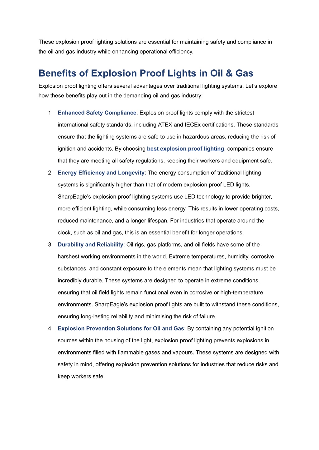 These explosion proof lighting solutions are essential for maintaining safety and compliance in the oil and gas industry while enhancing operational efficiency. Benefits of Explosion Proof Lights in Oil & Gas Explosion proof lighting offers several advantages over traditional lighting systems. Let’s explore how these benefits play out in the demanding oil and gas industry: 1. Enhanced Safety Compliance: Explosion proof lights comply with the strictest international safety standards, including ATEX and IECEx certifications. These standards ensure that the lighting systems are safe to use in hazardous areas, reducing the risk of ignition and accidents. By choosing best explosion proof lighting, companies ensure that they are meeting all safety regulations, keeping their workers and equipment safe. 2. Energy Efficiency and Longevity: The energy consumption of traditional lighting systems is significantly higher than that of modern explosion proof LED lights. SharpEagle’s explosion proof lighting systems use LED technology to provide brighter, more efficient lighting, while consuming less energy. This results in lower operating costs, reduced maintenance, and a longer lifespan. For industries that operate around the clock, such as oil and gas, this is an essential benefit for longer operations. 3. Durability and Reliability: Oil rigs, gas platforms, and oil fields have some of the harshest working environments in the world. Extreme temperatures, humidity, corrosive substances, and constant exposure to the elements mean that lighting systems must be incredibly durable. These systems are designed to operate in extreme conditions, ensuring that oil field lights remain functional even in corrosive or high-temperature environments. SharpEagle’s explosion proof lights are built to withstand these conditions, ensuring long-lasting reliability and minimising the risk of failure. 4. Explosion Prevention Solutions for Oil and Gas: By containing any potential ignition sources within the housing of the light, explosion proof lighting prevents explosions in environments filled with flammable gases and vapours. These systems are designed with safety in mind, offering explosion prevention solutions for industries that reduce risks and keep workers safe.