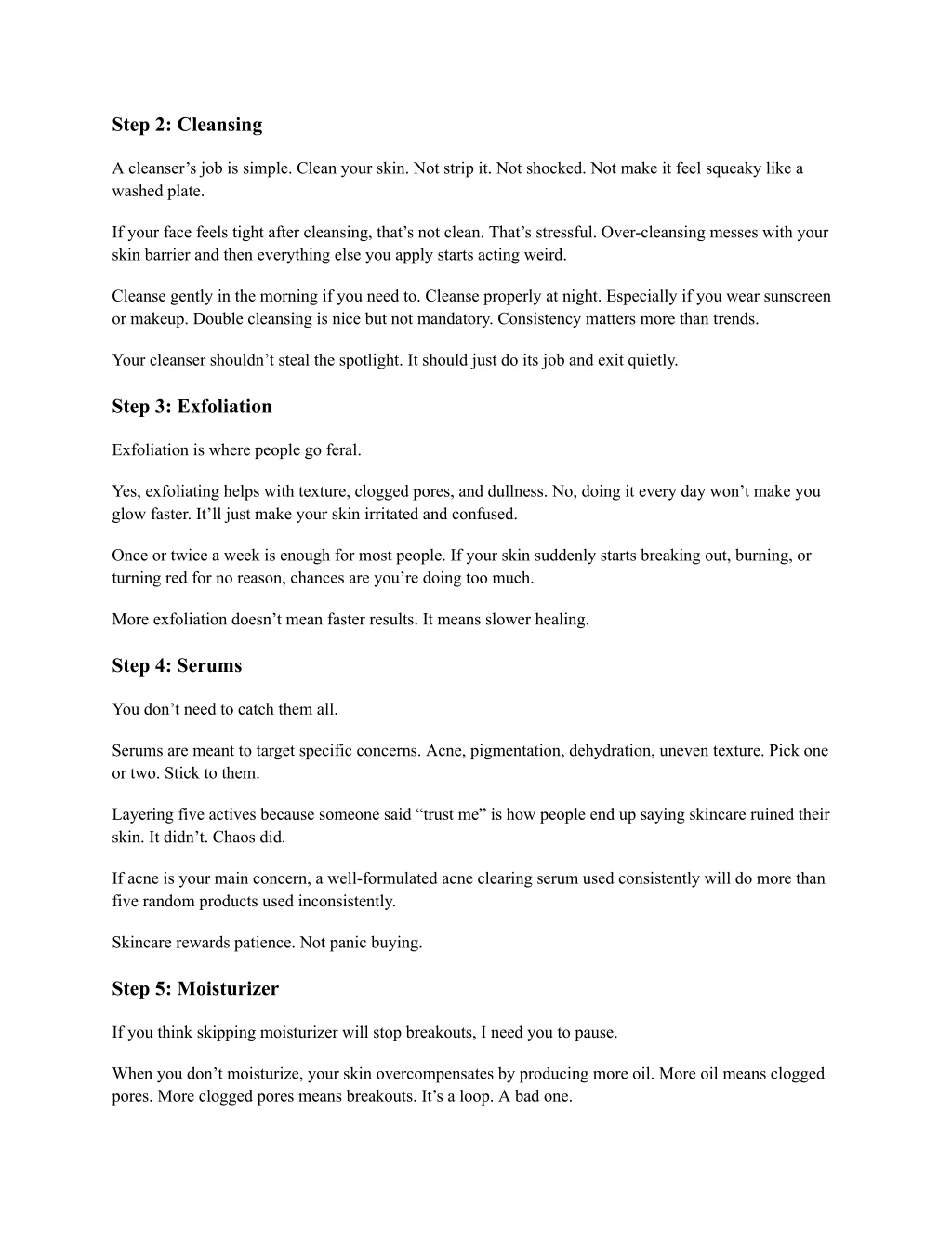 Step 2: Cleansing A cleanser’s job is simple. Clean your skin. Not strip it. Not shocked. Not make it feel squeaky like a washed plate. If your face feels tight after cleansing, that’s not clean. That’s stressful. Over-cleansing messes with your skin barrier and then everything else you apply starts acting weird. Cleanse gently in the morning if you need to. Cleanse properly at night. Especially if you wear sunscreen or makeup. Double cleansing is nice but not mandatory. Consistency matters more than trends. Your cleanser shouldn’t steal the spotlight. It should just do its job and exit quietly. Step 3: Exfoliation Exfoliation is where people go feral. Yes, exfoliating helps with texture, clogged pores, and dullness. No, doing it every day won’t make you glow faster. It’ll just make your skin irritated and confused. Once or twice a week is enough for most people. If your skin suddenly starts breaking out, burning, or turning red for no reason, chances are you’re doing too much. More exfoliation doesn’t mean faster results. It means slower healing. Step 4: Serums You don’t need to catch them all. Serums are meant to target specific concerns. Acne, pigmentation, dehydration, uneven texture. Pick one or two. Stick to them. Layering five actives because someone said “trust me” is how people end up saying skincare ruined their skin. It didn’t. Chaos did. If acne is your main concern, a well-formulated acne clearing serum used consistently will do more than five random products used inconsistently. Skincare rewards patience. Not panic buying. Step 5: Moisturizer If you think skipping moisturizer will stop breakouts, I need you to pause. When you don’t moisturize, your skin overcompensates by producing more oil. More oil means clogged pores. More clogged pores means breakouts. It’s a loop. A bad one.
