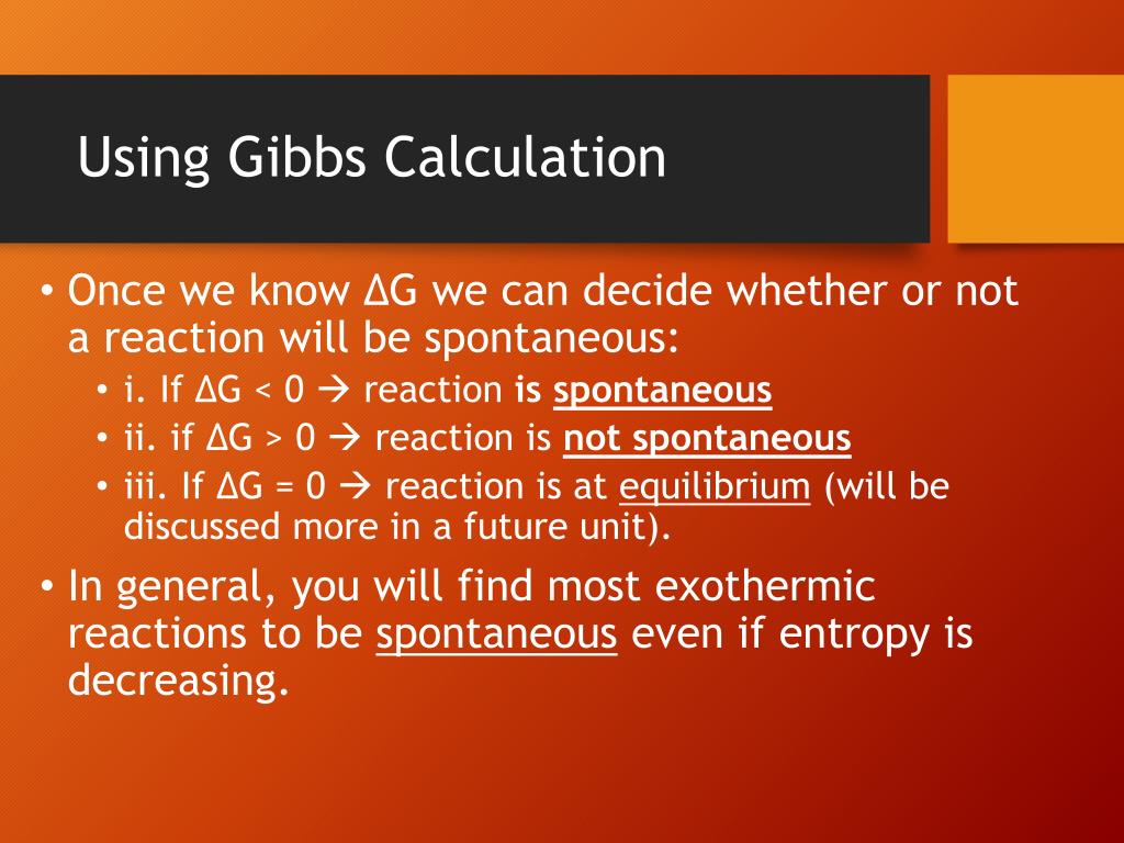 Using Gibbs Calculation • Once we know ΔG we can decide whether or not a reaction will be spontaneous: • i. If ΔG < 0 reaction is spontaneous • ii. if ΔG > 0 reaction is not spontaneous • iii. If ΔG = 0 reaction is at equilibrium (will be discussed more in a future unit). • In general, you will find most exothermic reactions to be spontaneous even if entropy is decreasing.