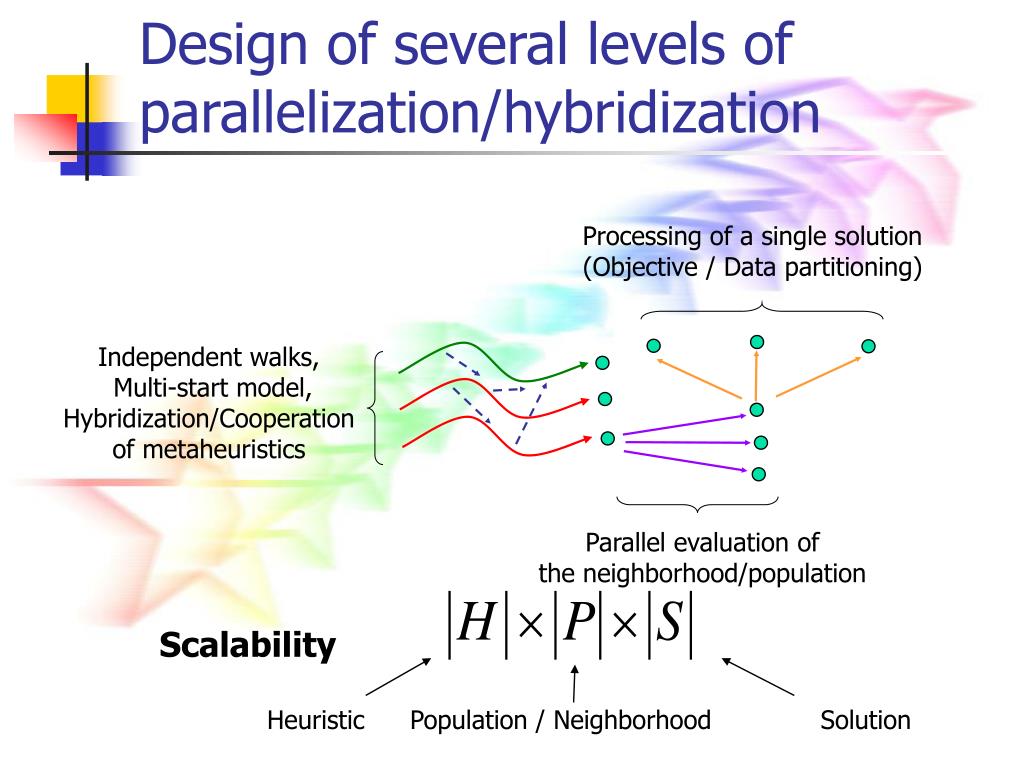Design of several levels of parallelization/hybridization Processing of a single solution(Objective / Data partitioning) Independent walks, Multi-start model, Hybridization/Cooperationof metaheuristics Parallel evaluation ofthe neighborhood/population Scalability Heuristic Population / Neighborhood Solution