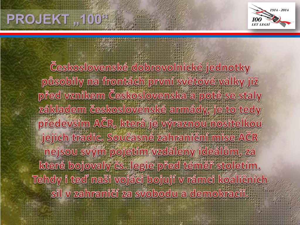 PROJEKT „100“ Československé dobrovolnické jednotky působily na frontách první světové války již před vznikem Československa a poté se staly základem československé armády, je to tedy především AČR, která je výraznou nositelkou jejich tradic. Současné zahraniční mise AČR nejsou svým pojetím vzdáleny ideálům, za které bojovaly čs. legie před téměř stoletím. Tehdy i teď naši vojáci bojují v rámci koaličních sil v zahraničí za svobodu a demokracii.