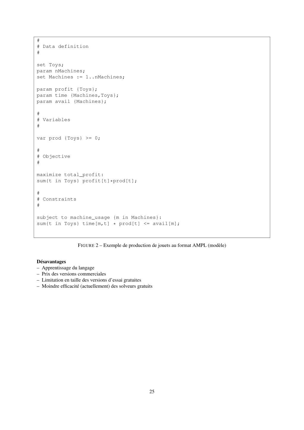 25. # # Data definition # set Toys; param nMachines; set Machines := 1..nMachines; param profit {Toys}; param time {Machines,Toys}; param avail {Machines}; # # Variables # var prod {Toys} >= 0; # # Objective # maximize total_profit: sum{t in Toys} profit[t]*prod[t]; # # Constraints # subject to machine_usage {m in Machines}: sum{t in Toys} time[m,t] * prod[t] <= avail[m]; FIGURE 2 – Exemple de production de jouets au format AMPL (modèle) Désavantages – Apprentissage du langage – Prix des versions commerciales – Limitation en taille des versions d’essai gratuites – Moindre efficacité (actuellement) des solveurs gratuits 25
