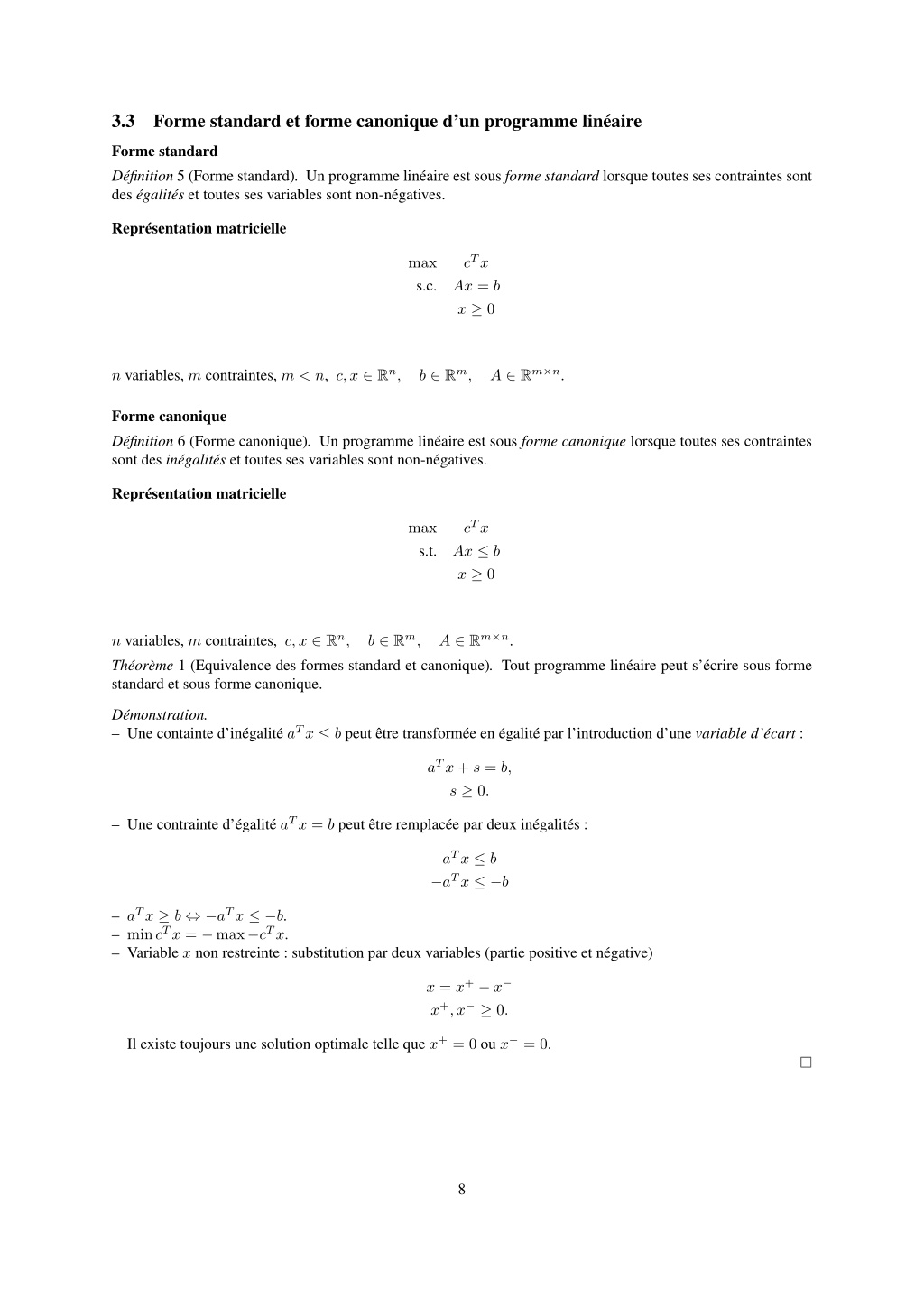 8. 3.3 Forme standard et forme canonique d’un programme linéaire Forme standard Définition 5 (Forme standard). Un programme linéaire est sous forme standard lorsque toutes ses contraintes sont des égalités et toutes ses variables sont non-négatives. Représentation matricielle cTx max s.c. Ax = b x ≥ 0 n variables, m contraintes, m < n, c,x ∈ Rn, A ∈ Rm×n. b ∈ Rm, Forme canonique Définition 6 (Forme canonique). Un programme linéaire est sous forme canonique lorsque toutes ses contraintes sont des inégalités et toutes ses variables sont non-négatives. Représentation matricielle cTx Ax ≤ b x ≥ 0 max s.t. n variables, m contraintes, c,x ∈ Rn, Théorème 1 (Equivalence des formes standard et canonique). Tout programme linéaire peut s’écrire sous forme standard et sous forme canonique. A ∈ Rm×n. b ∈ Rm, Démonstration. – Une containte d’inégalité aTx ≤ b peut être transformée en égalité par l’introduction d’une variable d’écart : aTx + s = b, s ≥ 0. – Une contrainte d’égalité aTx = b peut être remplacée par deux inégalités : aTx ≤ b −aTx ≤ −b – aTx ≥ b ⇔ −aTx ≤ −b. – mincTx = −max−cTx. – Variable x non restreinte : substitution par deux variables (partie positive et négative) x = x+− x− x+,x−≥ 0. Il existe toujours une solution optimale telle que x+= 0 ou x−= 0. 8