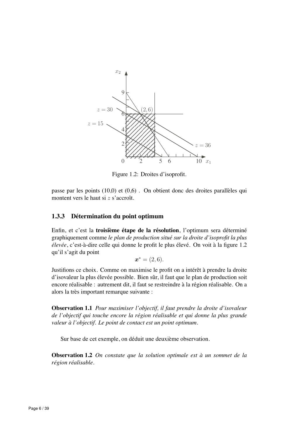 8. x2 9 z =30 (2,6) 6 z =15 4 2 z =36 0 2 5 6 10 x1 Figure 1.2: Droites d’isoprofit. passe par les points (10,0) et (0,6) . On obtient donc des droites parall` eles qui montent vers le haut si z s’accroˆ ıt. 1.3.3 D´ etermination du point optimum Enfin, et c’est la troisi` eme ´ etape de la r´ esolution, l’optimum sera d´ etermin´ e graphiquement comme le plan de production situ´ e sur la droite d’isoprofit la plus ´ elev´ ee, c’est-` a-dire celle qui donne le profit le plus ´ elev´ e. On voit ` a la figure 1.2 qu’il s’agit du point x∗= (2, 6). Justifions ce choix. Comme on maximise le profit on a int´ erˆ et ` a prendre la droite d’isovaleur la plus ´ elev´ ee possible. Bien sˆ ur, il faut que le plan de production soit encore r´ ealisable : autrement dit, il faut se restreindre ` a la r´ egion r´ ealisable. On a alors la tr` es important remarque suivante : Observation 1.1 Pour maximiser l’objectif, il faut prendre la droite d’isovaleur de l’objectif qui touche encore la r´ egion r´ ealisable et qui donne la plus grande valeur ` a l’objectif. Le point de contact est un point optimum. Sur base de cet exemple, on d´ eduit une deuxi` eme observation. Observation 1.2 On constate que la solution optimale est ` a un sommet de la r´ egion r´ ealisable. Page 6 / 39