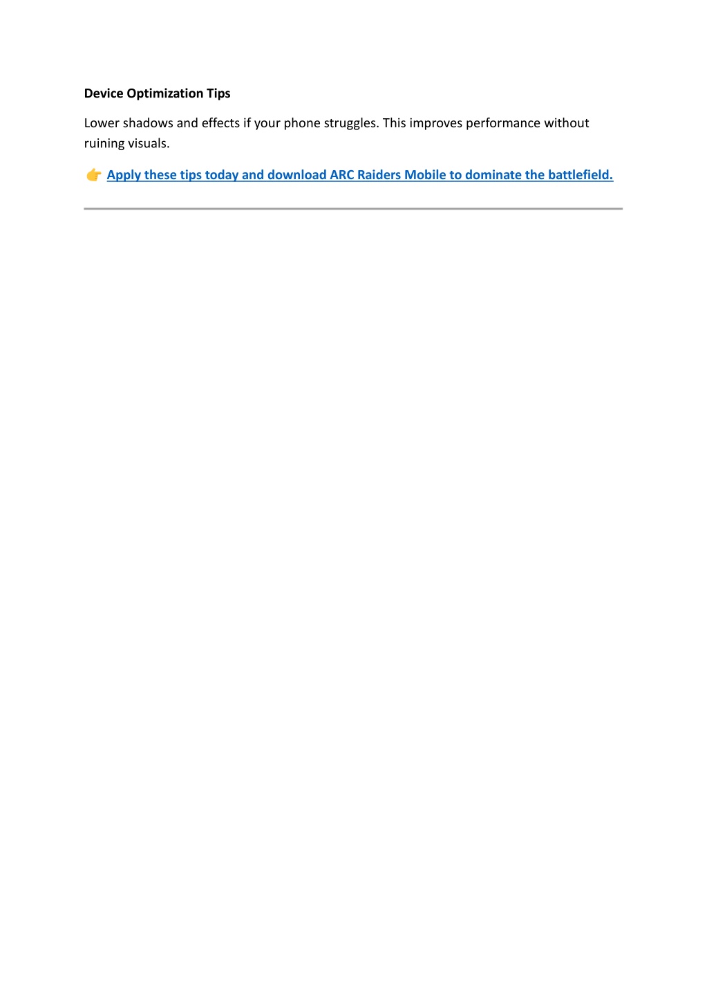 Device Optimization Tips Lower shadows and effects if your phone struggles. This improves performance without ruining visuals. Apply these tips today and download ARC Raiders Mobile to dominate the battlefield.