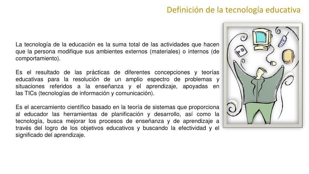 Definición de la tecnología educativa La tecnología de la educación es la suma total de las actividades que hacen que la persona modifique sus ambientes externos (materiales) o internos (de comportamiento). Es el resultado de las prácticas de diferentes concepciones y teorías educativas para la resolución de un amplio espectro de problemas y situaciones referidos a la enseñanza y el aprendizaje, apoyadas en las TICs (tecnologías de información y comunicación). Es el acercamiento científico basado en la teoría de sistemas que proporciona al educador las herramientas de planificación y desarrollo, así como la tecnología, busca mejorar los procesos de enseñanza y de aprendizaje a través del logro de los objetivos educativos y buscando la efectividad y el significado del aprendizaje.