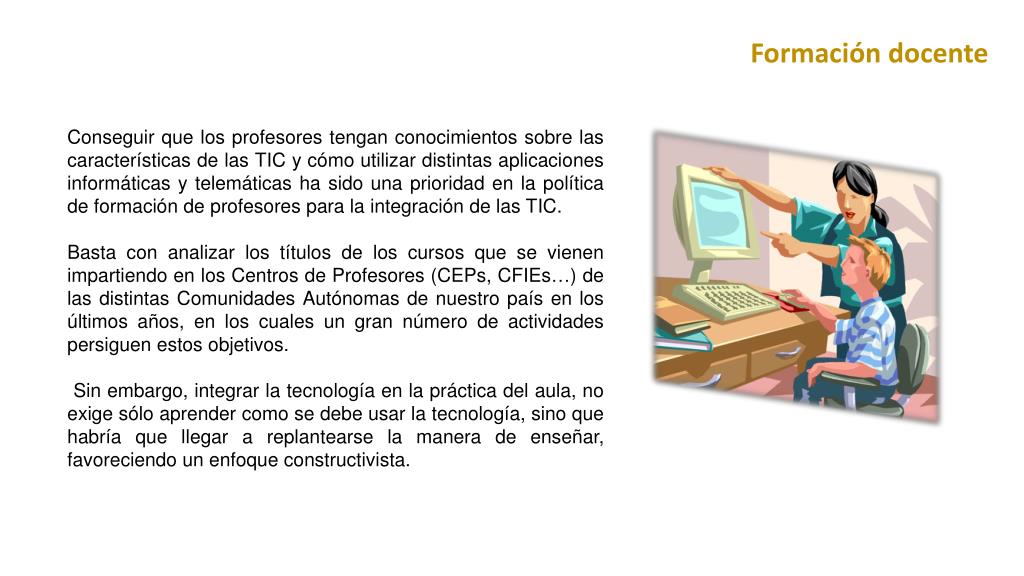 Formación docente Conseguir que los profesores tengan conocimientos sobre las características de las TIC y cómo utilizar distintas aplicaciones informáticas y telemáticas ha sido una prioridad en la política de formación de profesores para la integración de las TIC. Basta con analizar los títulos de los cursos que se vienen impartiendo en los Centros de Profesores (CEPs, CFIEs…) de las distintas Comunidades Autónomas de nuestro país en los últimos años, en los cuales un gran número de actividades persiguen estos objetivos. Sin embargo, integrar la tecnología en la práctica del aula, no exige sólo aprender como se debe usar la tecnología, sino que habría que llegar a replantearse la manera de enseñar, favoreciendo un enfoque constructivista.