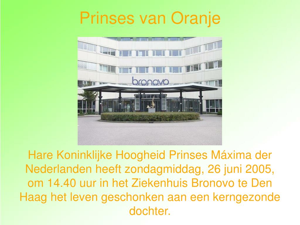 Prinses van Oranje. 26 juni 2005. Prinses van Oranje Hare Koninklijke Hoogheid Prinses Máxima der Nederlanden heeft zondagmiddag, 26 juni 2005, om 14.40 uur in het Ziekenhuis Bronovo te Den Haag het leven geschonken aan een kerngezonde dochter. Prinses van Oranje.