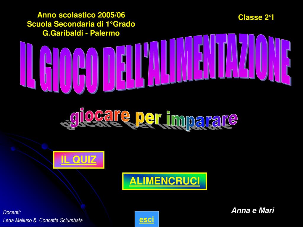 Anno scolastico 2005/06 Scuola Secondaria di 1°Grado G.Garibaldi - Palermo. Classe 2°I. IL GIOCO DELL'ALIMENTAZIONE. giocare per imparare. IL QUIZ. ALIMENCRUCI. Anna e Mari. Docenti: Leda Melluso & Concetta Sciumbata. esci. Alimenta.. QUIZ!. entra. Copertina di: Katia & Desirèe.