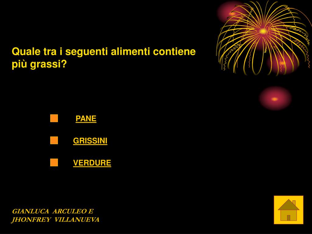 Quale tra i seguenti alimenti contiene più grassi? PANE GRISSINI VERDURE GIANLUCA ARCULEO E JHONFREY VILLANUEVA