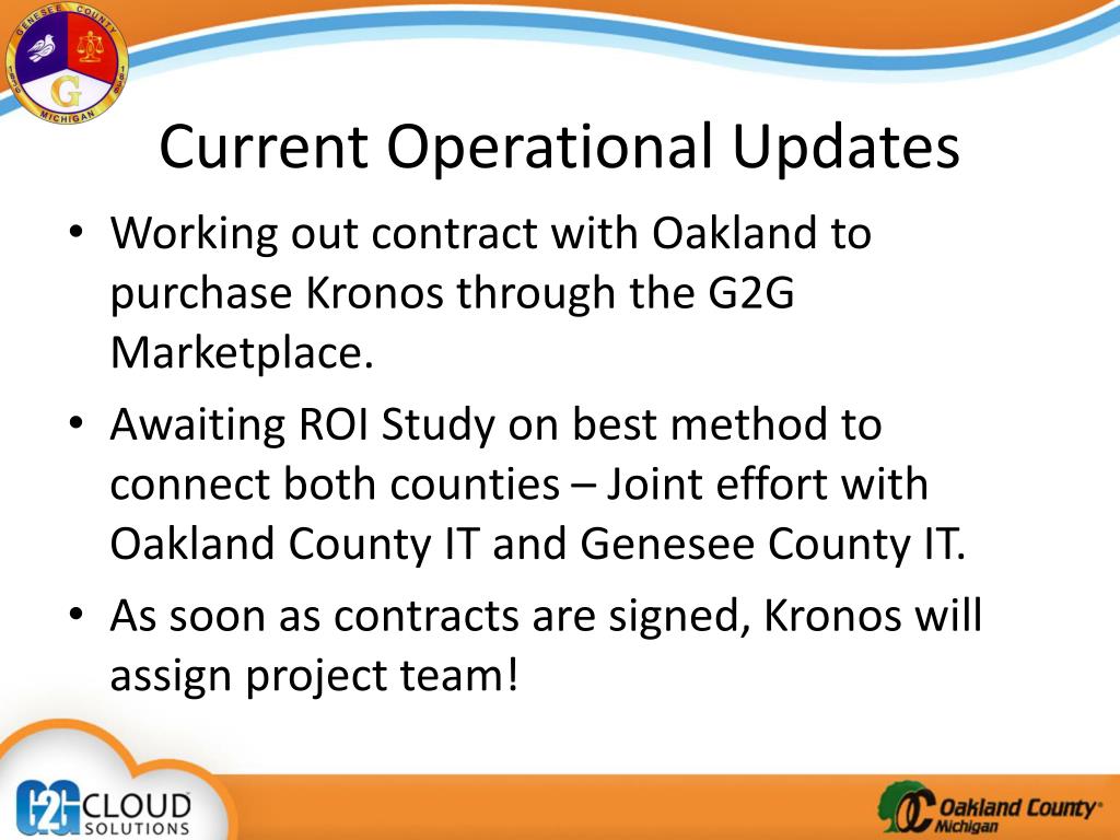Current Operational Updates Working out contract with Oakland to purchase Kronos through the G2G Marketplace. Awaiting ROI Study on best method to connect both counties – Joint effort with Oakland County IT and Genesee County IT. As soon as contracts are signed, Kronos will assign project team!