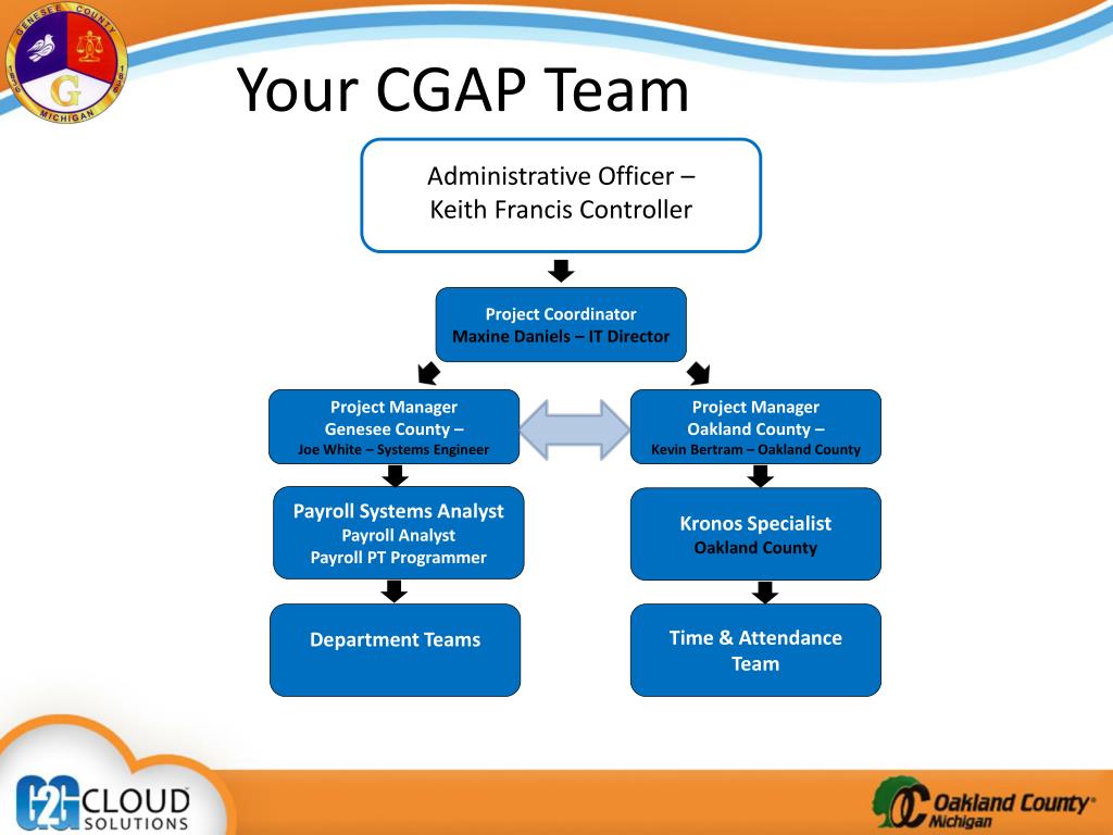 Your CGAP Team Administrative Officer –Keith Francis Controller Project Coordinator Maxine Daniels – IT Director Project ManagerGenesee County – Joe White – Systems Engineer Project ManagerOakland County – Kevin Bertram – Oakland County Payroll Systems Analyst Payroll Analyst Payroll PT Programmer Kronos Specialist Oakland County Department Teams Time & Attendance Team