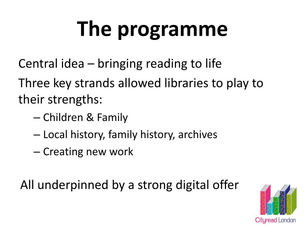 The programme Central idea – bringing reading to life Three key strands allowed libraries to play to their strengths: • Children & Family • Local history, family history, archives • Creating new work All underpinned by a strong digital offer