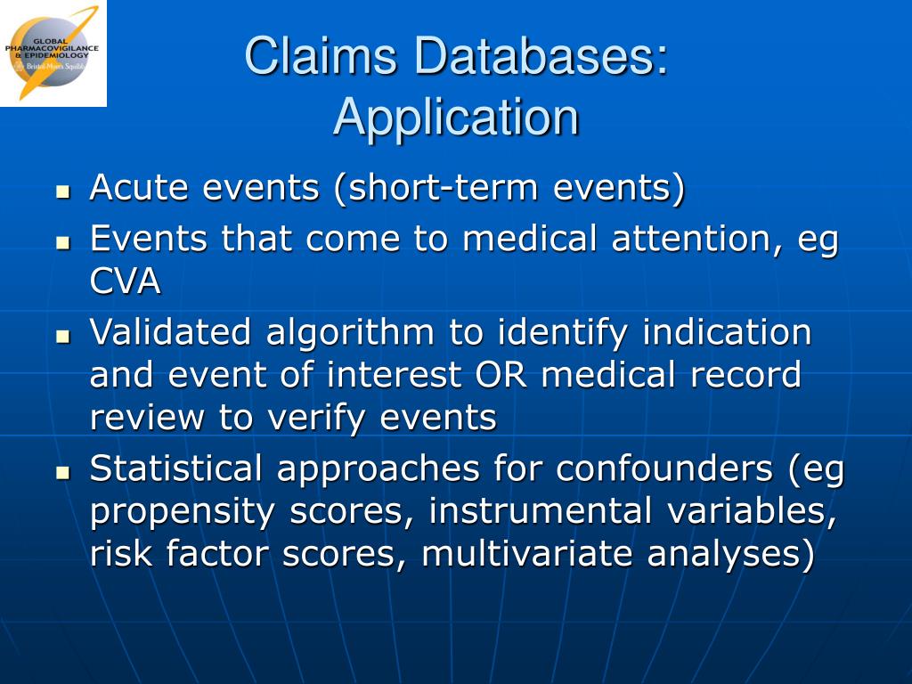 Claims Databases: Application • Acute events (short-term events) • Events that come to medical attention, eg CVA • Validated algorithm to identify indication and event of interest OR medical record review to verify events • Statistical approaches for confounders (eg propensity scores, instrumental variables, risk factor scores, multivariate analyses)