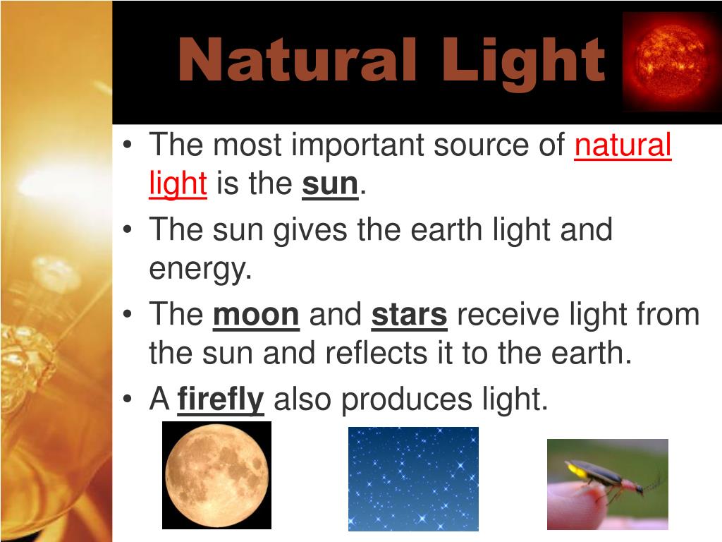 Natural Light • The most important source of natural light is the sun. • The sun gives the earth light and energy. • The moon and stars receive light from the sun and reflects it to the earth. • A firefly also produces light.