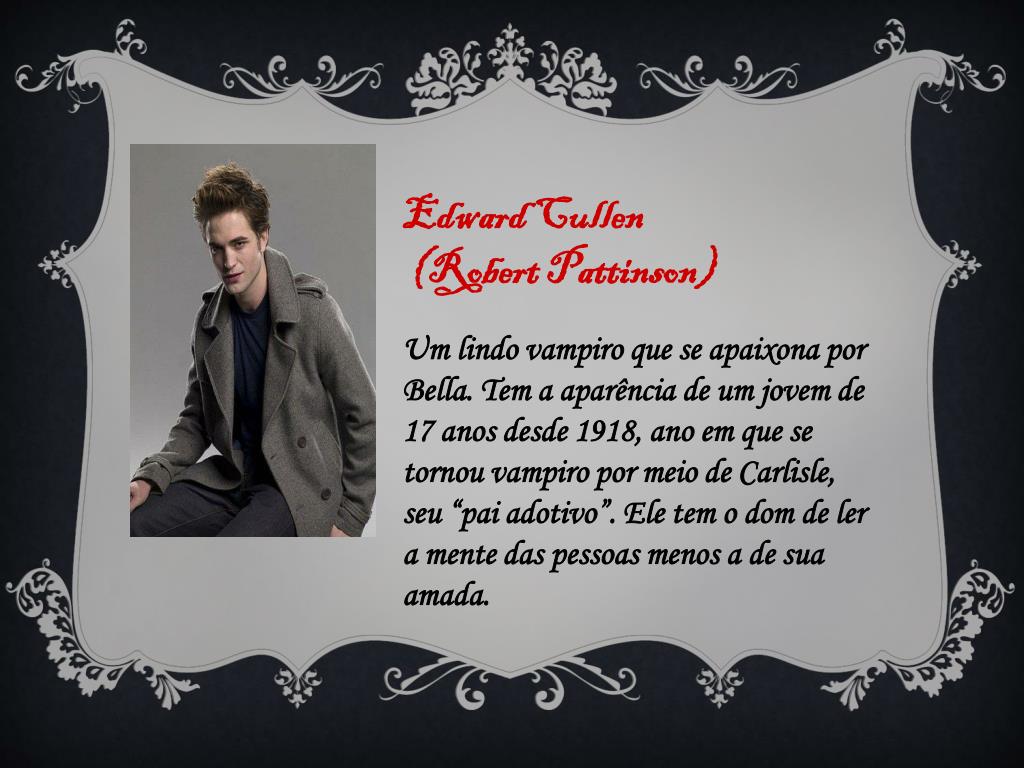 Edward Cullen (Robert Pattinson) Um lindo vampiro que se apaixona por Bella. Tem a aparência de um jovem de 17 anos desde 1918, ano em que se tornou vampiro por meio de Carlisle, seu “pai adotivo”. Ele tem o dom de ler a mente das pessoas menos a de sua amada.