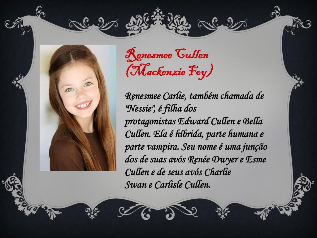 Renesmee Cullen (Mackenzie Foy) Renesmee Carlie, também chamada de "Nessie", é filha dos protagonistas Edward Cullen e Bella Cullen. Ela é híbrida, parte humana e parte vampira. Seu nome é uma junção dos de suas avós Renée Dwyer e Esme Cullen e de seus avós Charlie Swan e Carlisle Cullen.