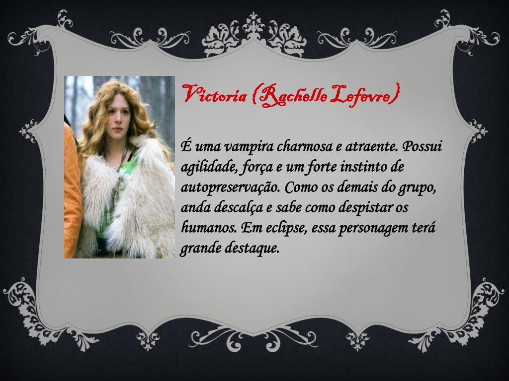 Victoria (Rachelle Lefevre) É uma vampira charmosa e atraente. Possui agilidade, força e um forte instinto de autopreservação. Como os demais do grupo, anda descalça e sabe como despistar os humanos. Em eclipse, essa personagem terá grande destaque.