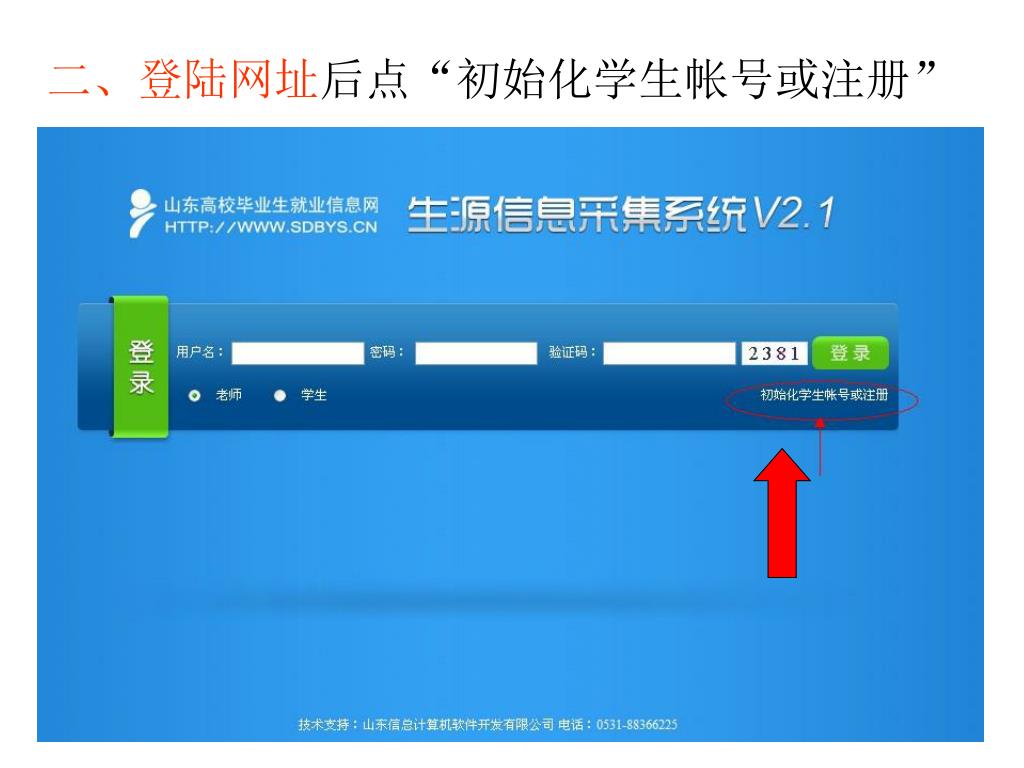2015 届毕业生生源信息采集. 一、登陆网址. 大专 http://10.0.0.123:8080 中专 http://10.0.0.123:8081. 二、登陆网址 后点“初始化学生帐号或注册”. 三、填写自己的学号和姓名后点查询. 四、点击“学生录入生源信息”. 五、生源信息完善特殊说明. 1. 用户名必须是“学号”,密码自己设置 。. 五、生源信息完善特殊说明. 2. 考生号在提供的“参考资料”里,“政治面貌”和“民族”必须填写 。. 五、生源信息完善特殊说明.