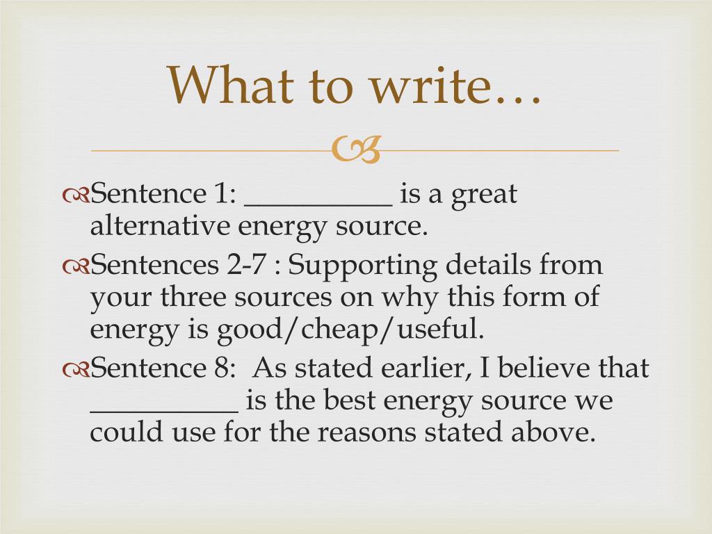 What to write… • Sentence 1: __________ is a great alternative energy source. • Sentences 2-7 : Supporting details from your three sources on why this form of energy is good/cheap/useful. • Sentence 8: As stated earlier, I believe that __________ is the best energy source we could use for the reasons stated above.