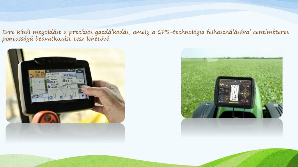 GPS-technológia A GPS-alapú méréstechnika először Észak-Amerikában jelent meg és indult hódító útjára a mezőgazdaságban, Európán belül a magyar cégek reagáltak leggyorsabban a technológiai újdonságokra. A mezőgazdasági termelés világszerte egyre nehezebb feltételek között zajlik, hiszen minden megművelt hektárból a lehető legtöbb termést kell kihozni.