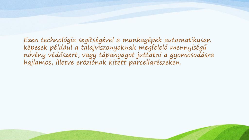 Források http://www.eco.hu/hir/technologiai-valtas-a-mezogazdasagban-ejjellato-kombanyok-gps-iranyitasu-vetogepek/ http://www.agroinform.com/files/forum/agroinform_20110322102258_20110318144.jpg http://agronaplo.hu/files/2013/10/77_1-A-sok-szigetel%C3%A9si-technol%C3%B3giaDSCF4855@.jpg http://www.agroinform.com/files/aktualis/agroinform_20140125180820_1238664799gabona.jpg http://www.eco.hu/wp-content/uploads/2013/11/Combine-6_1704457i.jpg http://www.teejet.com/media/233348/cl230-in-cab.jpg