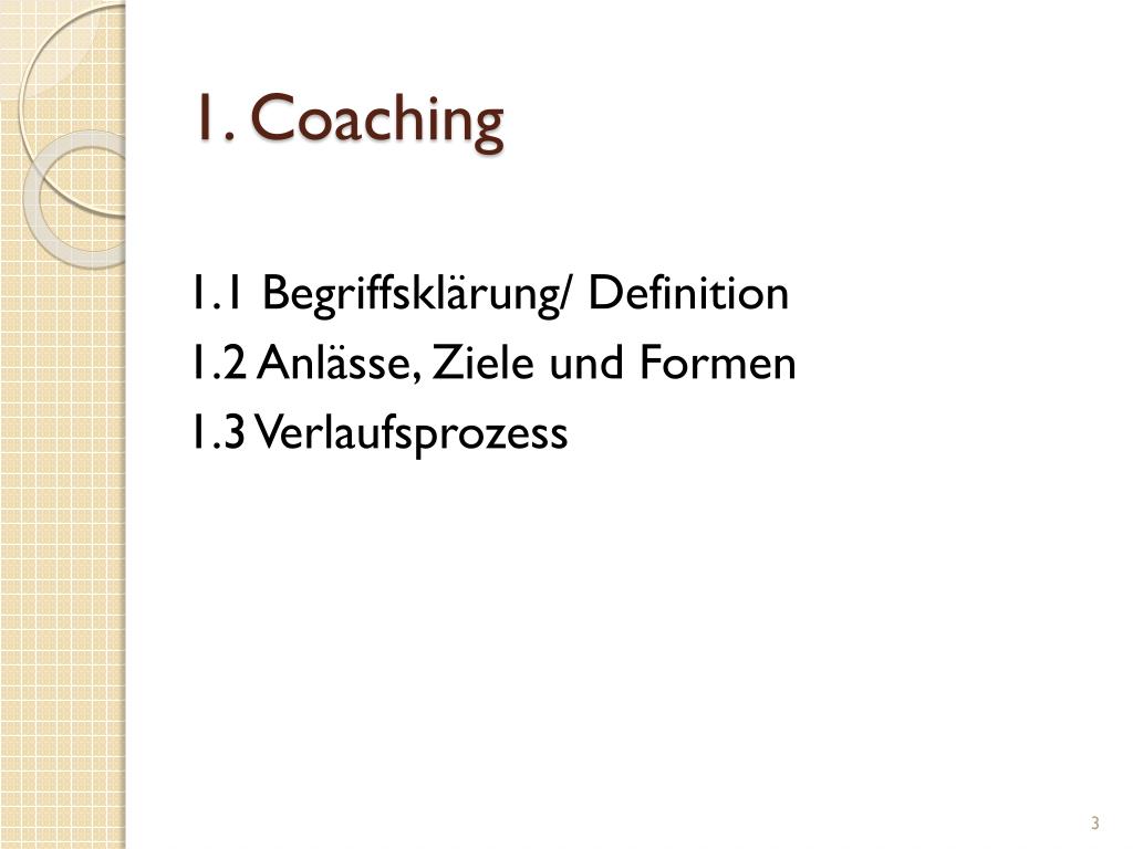 1. Coaching 1.1 Begriffsklärung/ Definition 1.2 Anlässe, Ziele und Formen 1.3 Verlaufsprozess